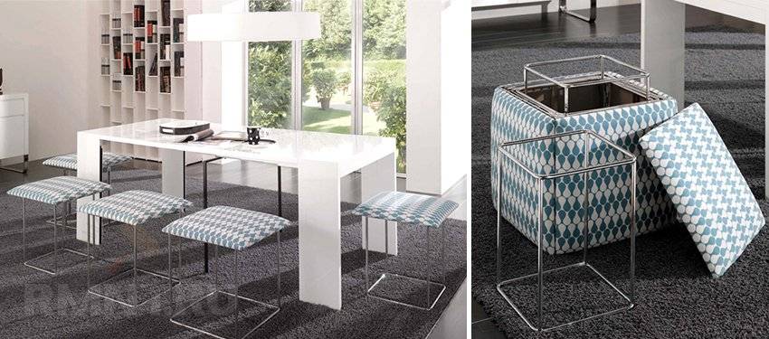 Негде хранить стулья? Пожалуйста, пуфик со скрытыми табуретками. Внутри него находится 5 основ, каждая из них меньше другой, за счёт чего они собираются как матрёшки. Мягкие стенки пуфика — это сиденья табуреток.