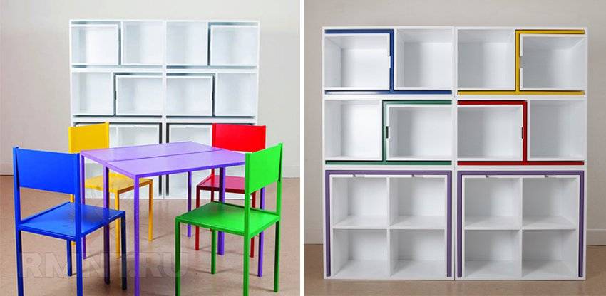 Подъемные кровати сочетаются со шкафами и стеллажами, стулья превращаются в пуфики, а письменный стол – в игровой журнальный. Очень популярны двухъярусные конструкции: сверху – спальное место, а снизу – рабочий угол, шкаф для вещей или маленький спортивный уголок. Современная модульная мебель также может собираться в «матрешку» и освобождать свободное место!