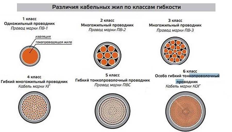 В зависимости от количества жил и их сечения гибкость может быть разной, поэтому кабеля разделяют на шесть классов.