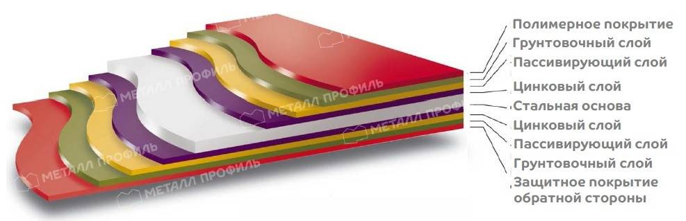 Разобравшись, как выглядит металлочерепица компании Металл Профиль, следует ответить на вопрос, из какого металла она изготовлена. Ответ прост — это холоднокатанная сталь высокого качества с целым бутербродом разных слоёв.