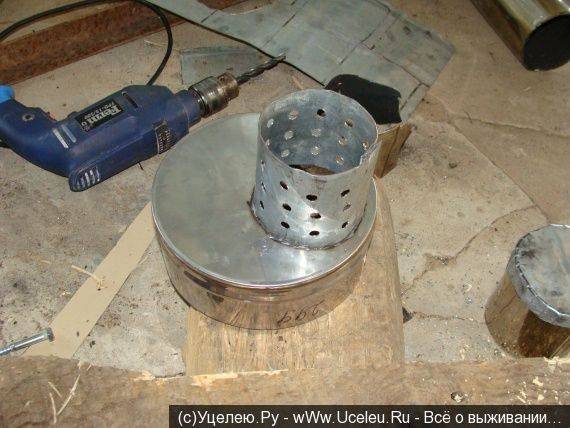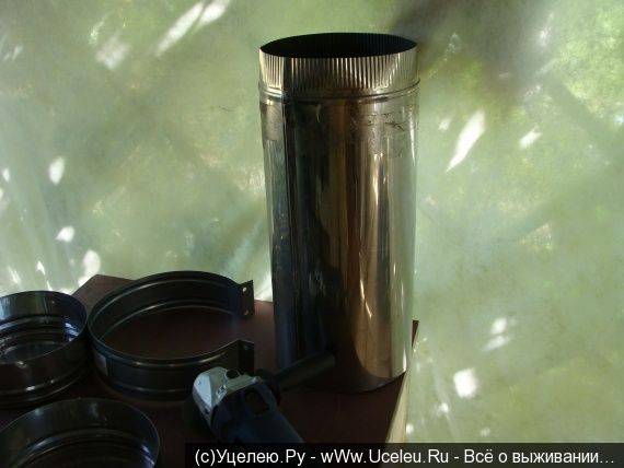 Данную печь можно легко смастерить своими руками, для чего вам понадобится жестяная труба диаметром 200 мм, 2 заглушки, труба 80-100 мм для дымохода и поддувала. Отрезаем кусок трубы 50 см и делаем отверстие под установку направляющей дымохода, куда устанавливается сгон и расклепывается с внутренней стороны, сама дымоходная труба крепится за счет хомута.