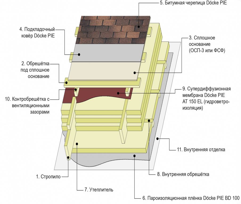 - вентиляционного зазора между битумным покрытием и утеплителем, смонтированным поверх пароизоляционного слоя;