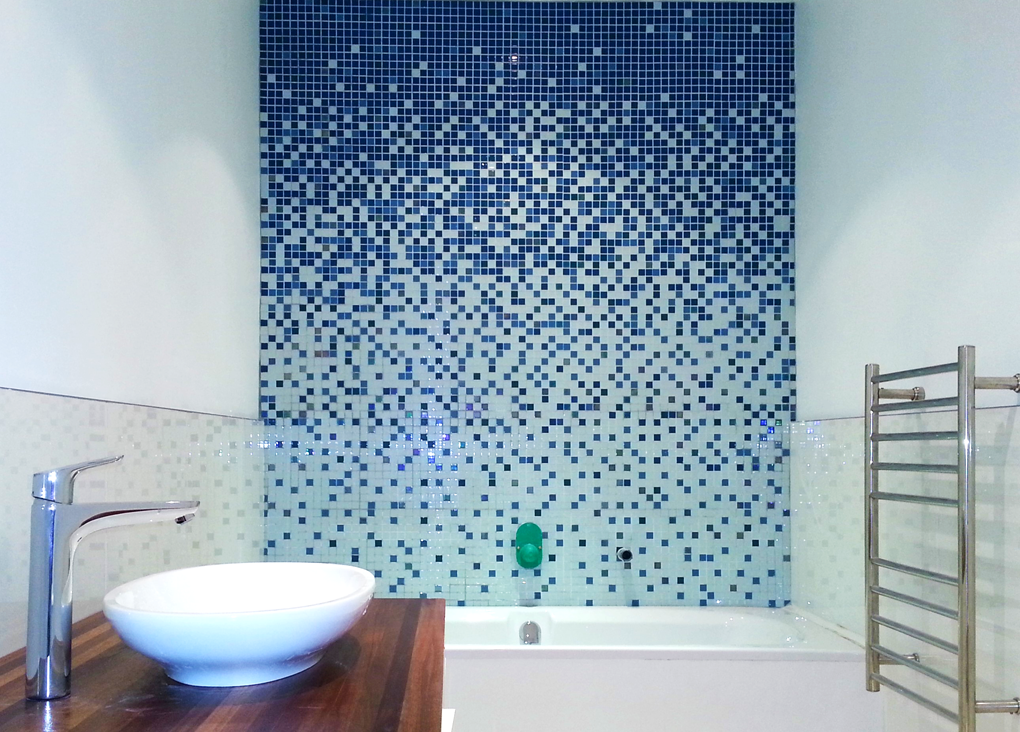 - Более тёмные оттенки лучше использовать внизу композиции, постепенно осветляя её кверху. Около потолка плитка должна быть максимально светлой.