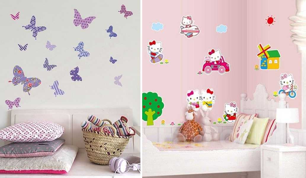 В детской и не только, можно при помощи наклеек объединить все в один ансамбль. Для этого используют однотипные наклейки разных размеров. Их можно наклеить на стены, мебель, потолок. Один из приемов — переход с одной стены на другую, с предмета мебели на стену или на другой предмет.