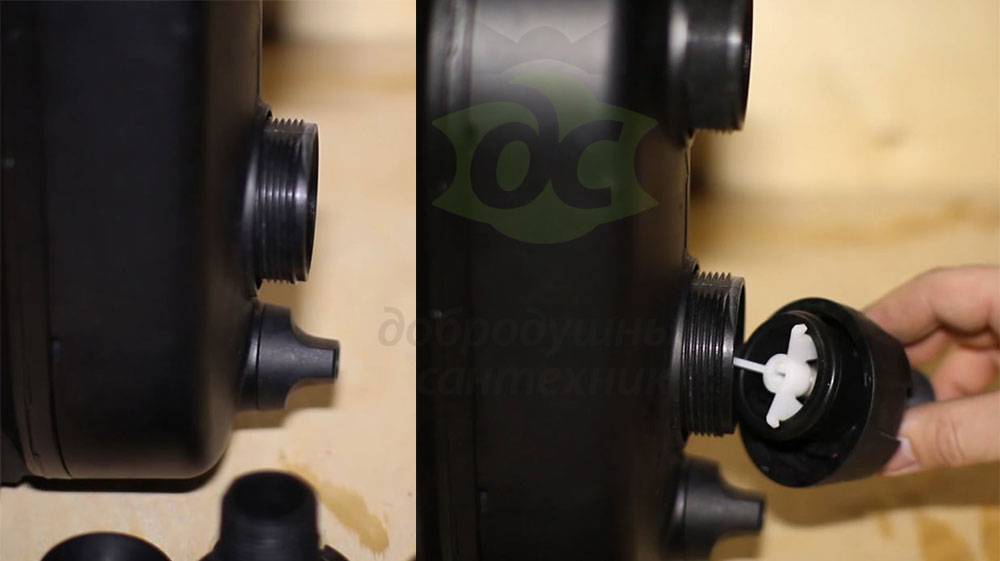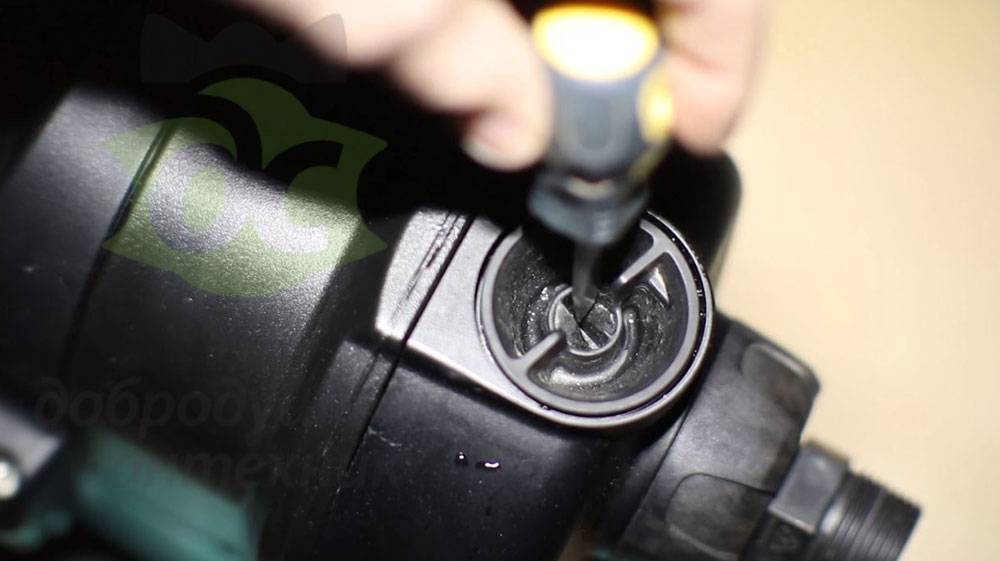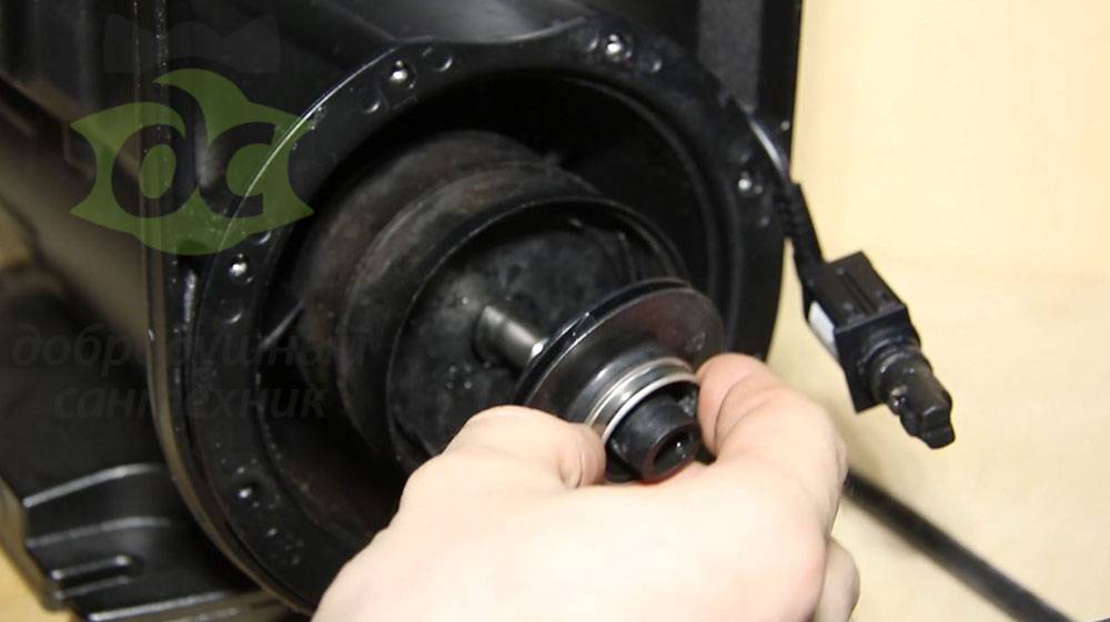 Если туда попала грязь, то это сразу будет видно. Для очистки придётся снять группу рабочих колёс. Для этого, со стороны шильдика насоса, надо удерживать вал толстой шлицевой отвёрткой и открутить гайку со стороны рабочих колёс.