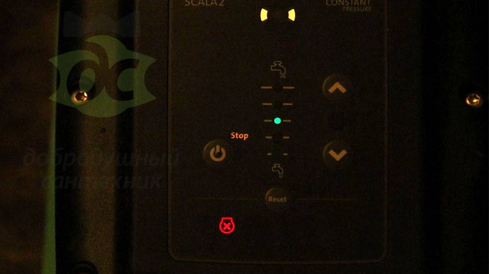 На панели сверху, самый главный индикатор, это индикатор работы или состояния станции. Если он не светится — станция отключена.Два индикатора горизонтально светятся — насос включён но не работает.