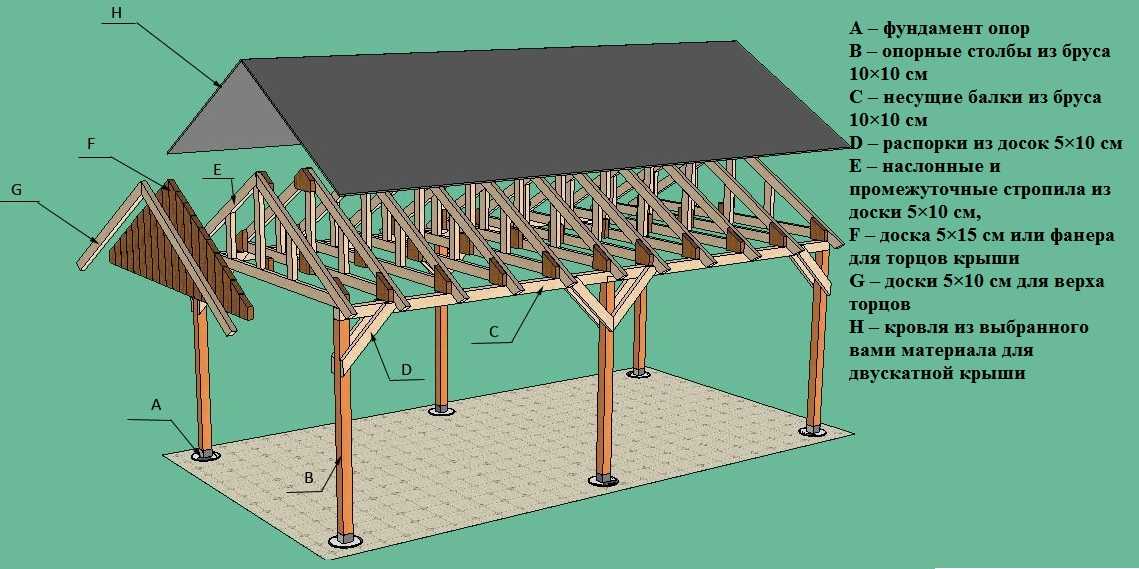 В случае с деревянным навесом под двускатной крышей система получается многокомпонентная.