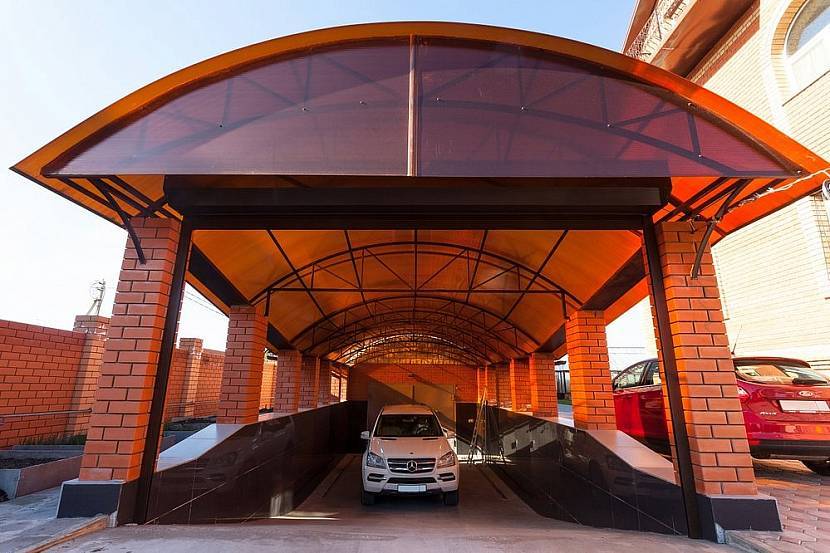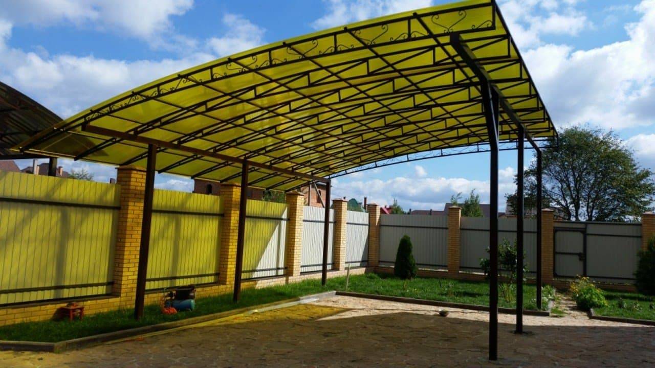 Кровля для авто из поликарбоната способна пропускать солнечный свет, что придает легкость всему строению. При этом для постройки во дворе можно применять поликарбонат различной толщины и разнообразной цветовой палитрой. Для покрытия применяются разные кровельные материалы.