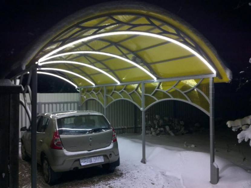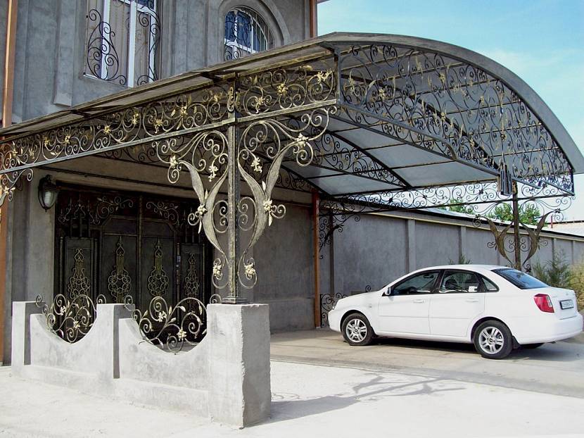 Навесная конструкция декорируется по своему усмотрению, но так, чтобы украшения не мешали въезду-выезду автомобиля. Для металлического, кирпичного сооружения оптимально подойдут изящные кованые детали (перила, карнизы), растения в кашпо, расположенные под самой крышей, светодиодная подсветка, гирлянда. Выполненное из дерева – оформляется резьбой, тонируется под элитные породы, расписывается узорами вручную. Допускается монтаж перил из точеных деревянных балясин, ажурных декоративных решеток.