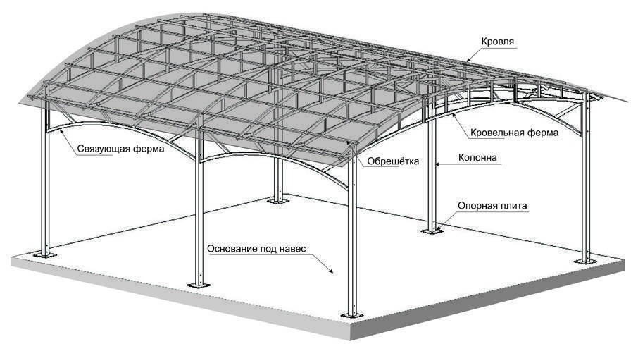 В случае, когда проект навеса имеет арочное перекрытие, необходимо согнуть в форму дуги несколько металлических труб либо взять округлые брусья. Для обустройства односкатной крыши каркас с одной стороны нужно приподнять примерно на 30 см. Если крыша будет угольной, в центральной части основы следует установить самые высокие опоры, от которых и будет производиться спуск крыши вниз.