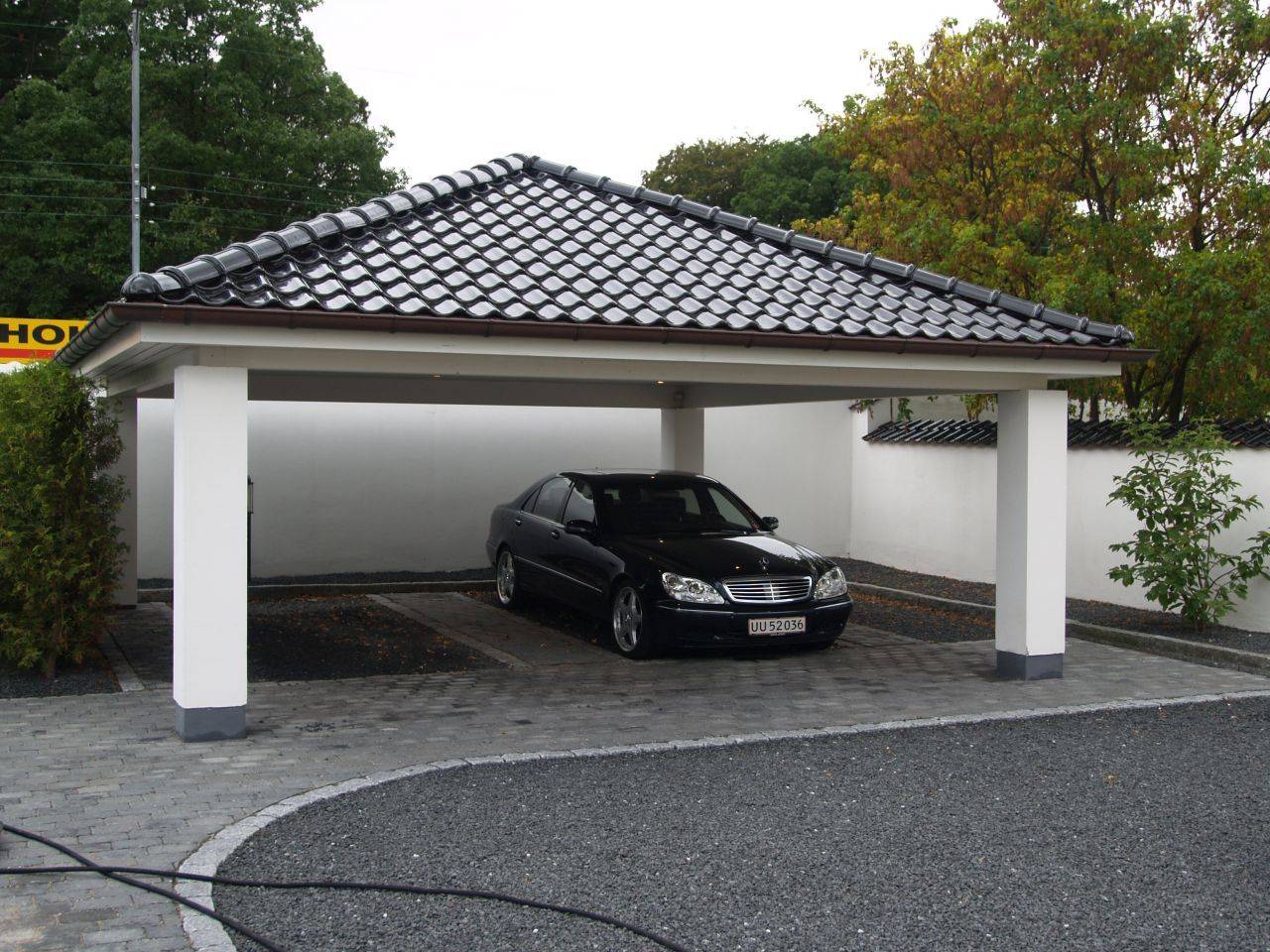 На фото вы можете посмотреть варианты из металлочерепицы. Имея под руками чертежи, вы можете сделать простые конструкции своими руками. Если кровля для основного здания делается из такого материала, то можно сделать пристроенный навес под одной крышей. В этом случае можно сделать полностью закрытую конструкцию для установки автомобиля.