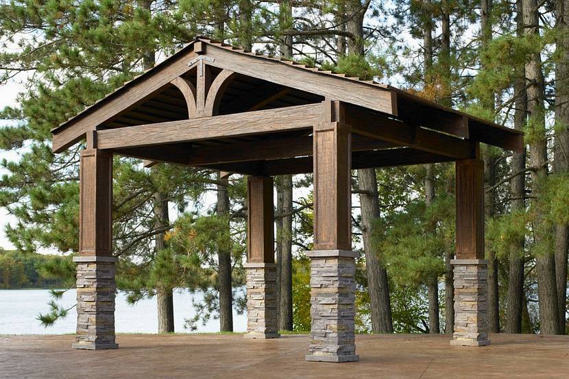 Камень в сочетании с деревянными массивными балками — интересный вариант для навеса.
