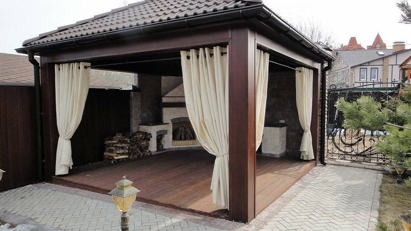 При подборе материала учитывайте дизайн сооружение возле дома и само здание. Если все выполнено из бруса, то превосходный вариант строительство из досок. Если весь дачный ансамбль возведен с помощью профнастила, то и остальные конструкции делаются из такого же материала.