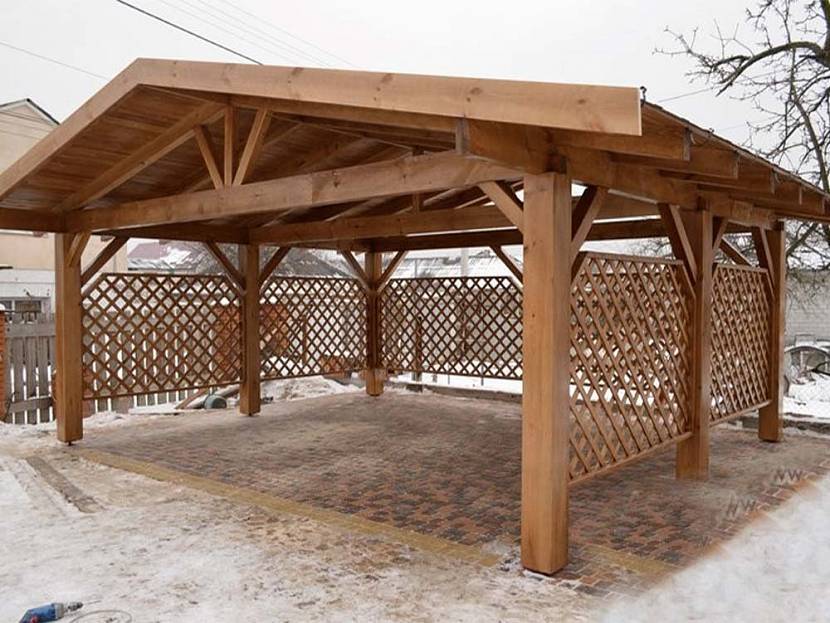 Собрать самодельную конструкцию из древесины сможет тот, кто более-менее разбирается в столярном деле и строительстве. Самостоятельная обработка и подготовка дерева приводит к значительной потере времени. Она включает резку, заготовку элементов. Хотя предварительные работы и займут минимум неделю, выполнение будет относительно несложным, тем более что для работы по дереву есть наибольший выбор инструментов. Все узлы соединяют пластинами и метизами. Используют древесину в основном в виде брусков. Их вставляют в фундамент или вкручивают специальными металлическими соединениями с крупными анкерами. Материал для навеса обрабатывают с двойной внимательностью, чтобы рядом с транспортом и автомобильными принадлежностями на дереве не появился грибок. С точки зрения эстетики, худшее что может случиться — это растрескивание. Дерево уступает по долговечности остальным материалам.