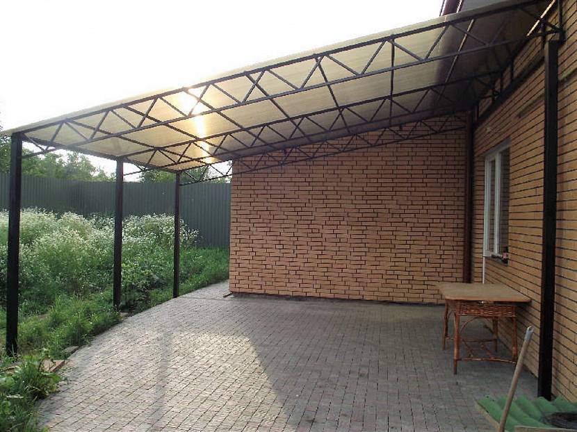 Если полного затенения не требуется, можно использовать поликарбонат. Он, кстати, самый популярный в последнее время материал. Только выбирать его необходимо правильно: брать многокамерный, имеющий как минимум, три слоя пластика и два ряда ячеек. Под таким навесом из поликарбоната даже в солнечный день нежарко.