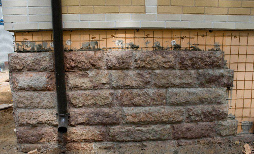 Но если вам, все-таки так сильно хочется обложить нулевой цикл нового дома, то можно по нижней кромке дюбелями набить металлический уголок с небольшим зазором снизу. Он послужит жесткой опорой для каменной облицовки.