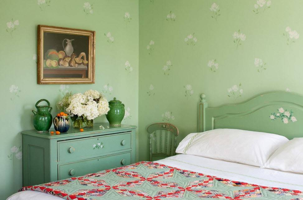 Спальня-прованс, оформленная в оттенках зеленого цвета, ассоциируется с весной, теплом и единением с природой. По канонам стиля базовую основу интерьера составляют самые светлые оттенки: оливковый, светло-зеленый, бежевый, серый или белый.