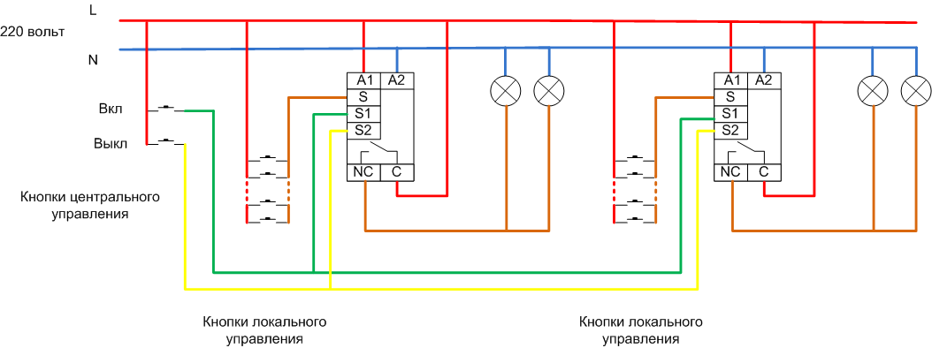 Другой вариант схемы – с использованием приоритетных входов для включения или отключения. Такой принцип используется, когда надо обеспечить централизованное управление освещением нескольких комнат или зон. При манипуляциях кнопками центрального управления состояние ламп не будет зависеть от предыдущего положения – все светильники можно включить или выключить одновременно. Подобное двухканальное включение позволяет с одного места включить или отключить свет сразу во всех помещениях, а в дальнейшем управлять светом с локальных кнопок.