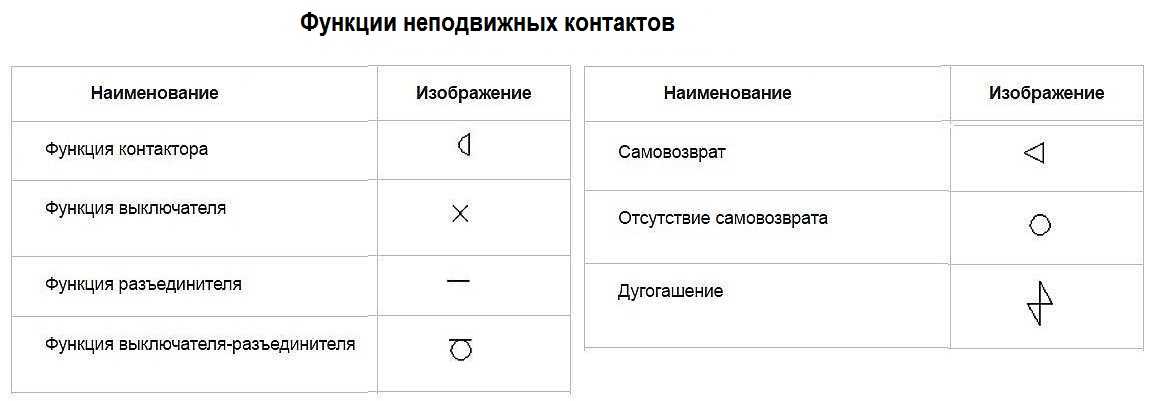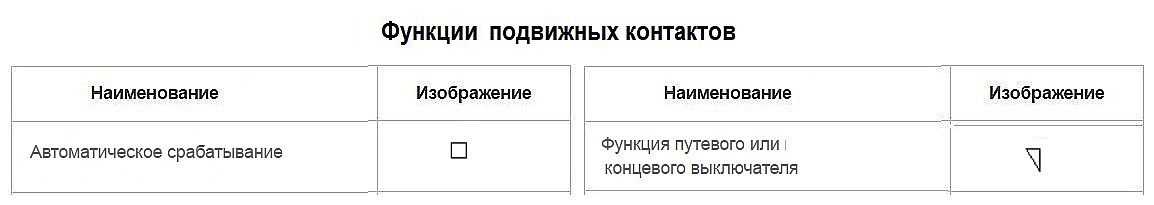 Кроме того, контакты могут выполнять разные функции: контактора, разъединителя, выключателя и т.п. Все они также имеют условное обозначение и наносятся на соответствующие контакты. Есть функции, которые выполняют только подвижные контакты. Они приведены на фото ниже.