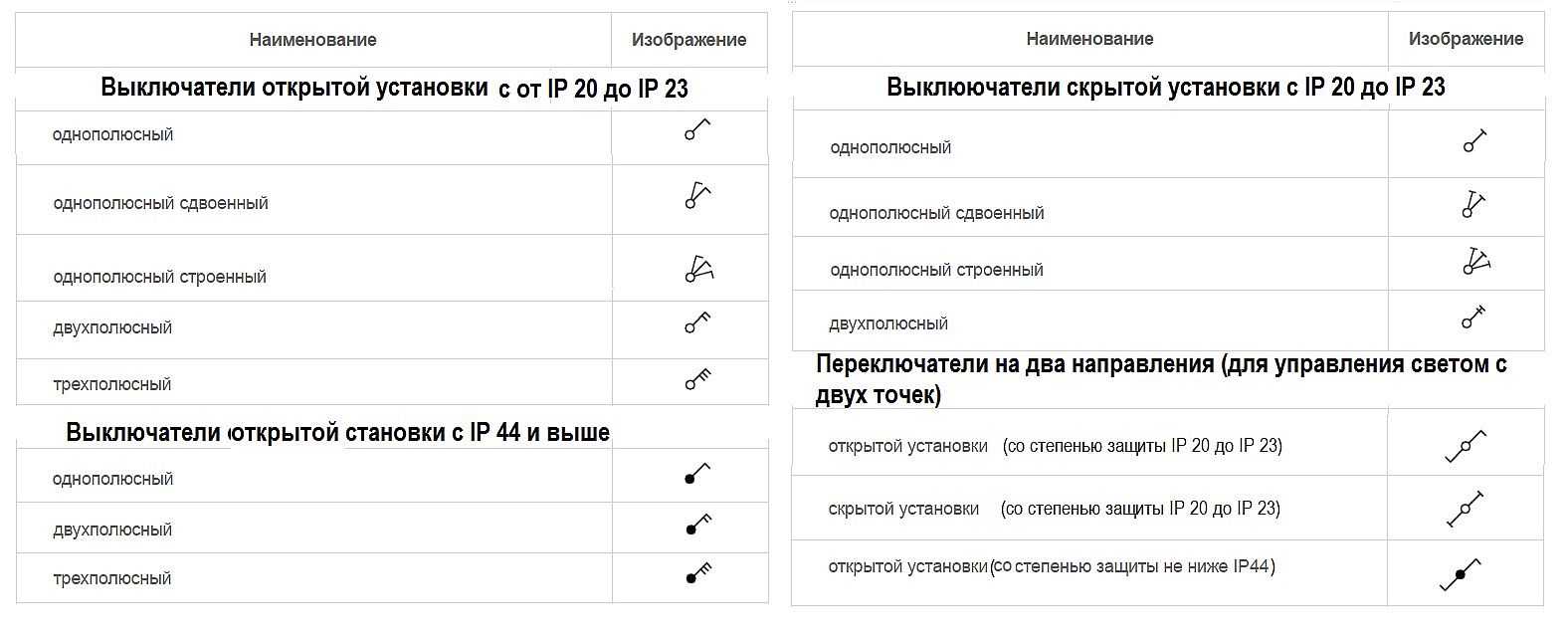 Условные обозначения выключателей на чертежах и схемах