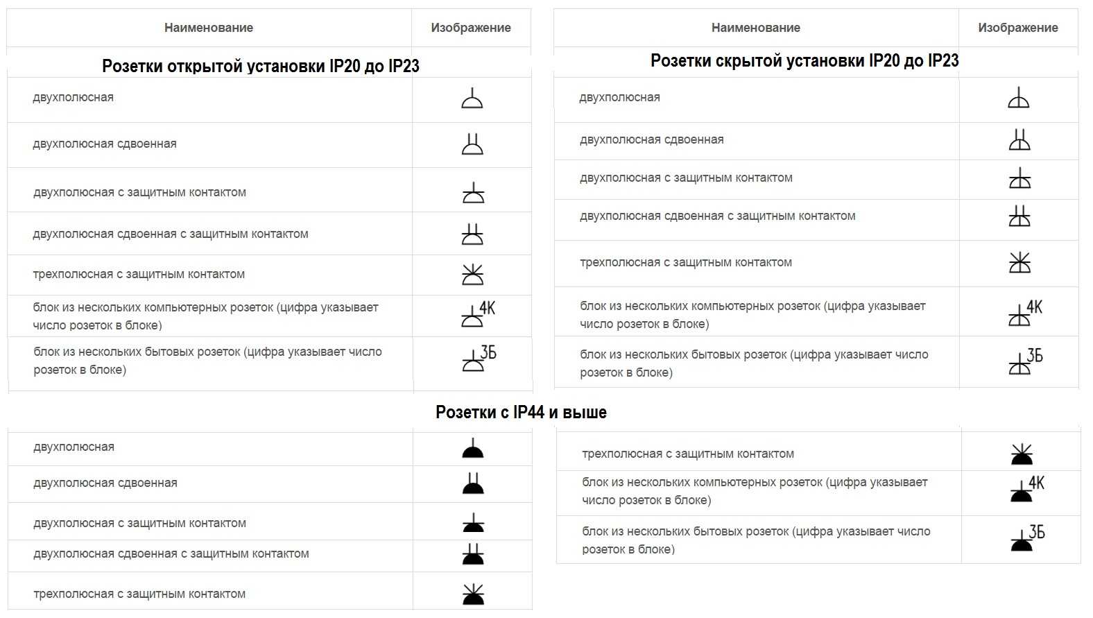 В обозначениях розеток и розеточных групп наблюдается та же тенденция: есть одинарные, сдвоенные розетки, есть группы из нескольких штук. Изделия для помещений с нормальными условиями эксплуатации (IP от 20 до 23) имеют неокрашенную середину, для влажных с корпусом повышенной защиты (IP44 и выше) середина тонируется темным цветом.
