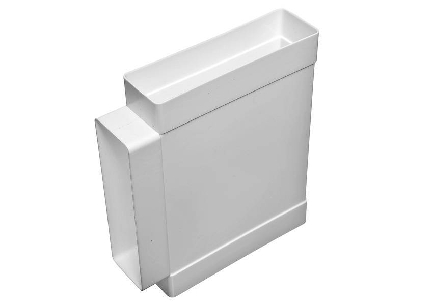 Работа вентиляции, в таком случае будет выглядеть так: при включении вытяжки воздух будет заходить выше клапана. Часть воздушного потока заставит закрыться заслонку обратного клапана. Когда вытяжной зонт будет выключен, заслонка клапана откроется. При таком решении вы можете использовать для подключения кухонного зонта не только гофру, но и прямоугольные вентиляционные трубы, которые имеют лучший дизайн и аэродинамические характеристики, чем у гофрированного воздуховода. Правда придется использовать переходник с круглого сечения на прямоугольное.