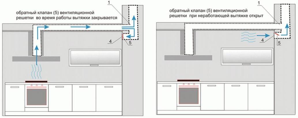 В продаже есть конструкция с отверстием под гофру и ниже небольшая решетки для естественной вентиляции.Но при такой конструкции может происходить обратный выпуск потока воздуха из вытяжки в кухню. В каком месте лучше установить обратный клапан при такой конструкции?