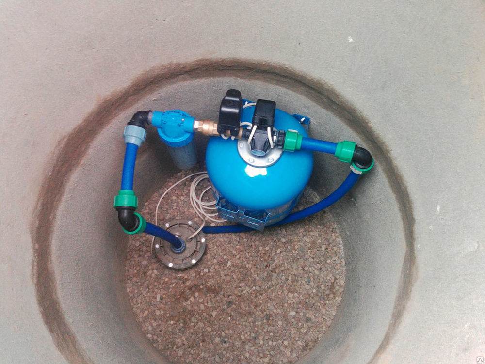 В этом случае преимуществом является то, что все узлы находятся вне дома, но при необходимости их обслуживать, проблем не возникает. Достаточно открыть люк, и все приборы находятся в доступности. Это нужно при обслуживании фильтра, ремонте насоса, ревизии гидробака. Здесь же монтируется обратный клапан, который не позволяет воде стекать в скважину, когда система не активна.