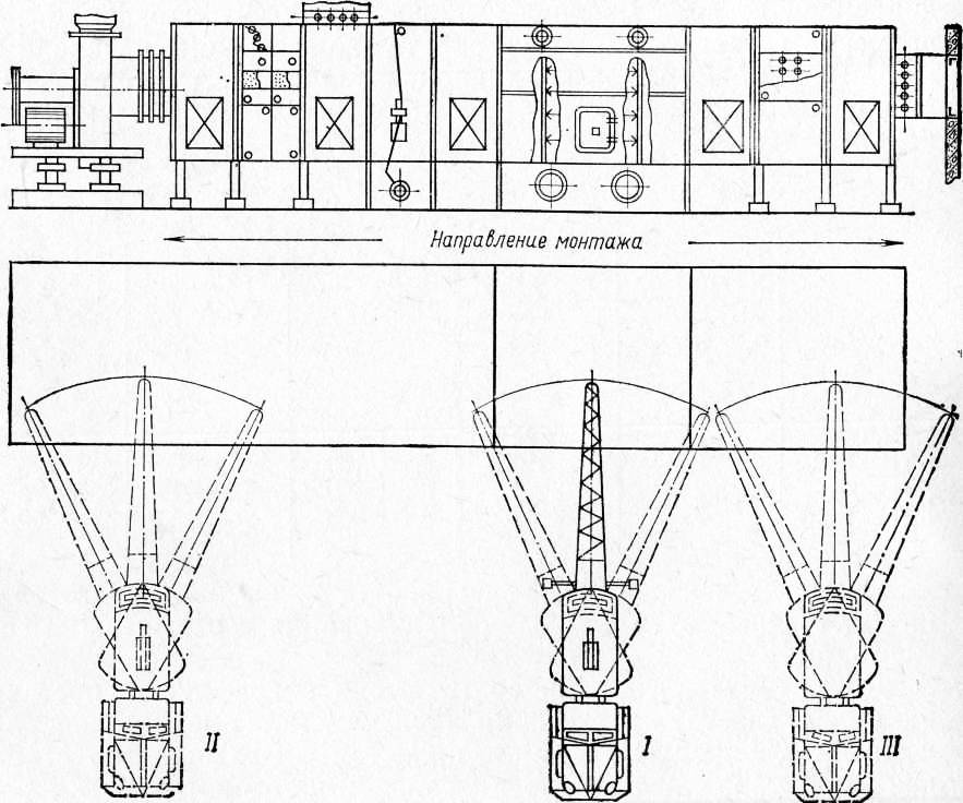 При монтаже кондиционера с помощью автокрана вначале монтируют оросительную камеру и дальнейшую сборку ведут в обе стороны от нее. Монтаж кондиционера с помощью козлового устройства или тельфера ведется в направлении от воздухоза-борного клапана к вентиляторному агрегату.