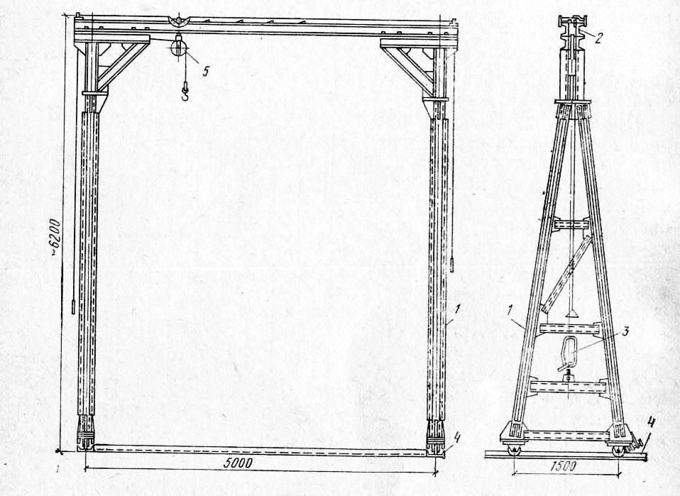 1 – опора; 2 – балка; 3 – рычажная лебедка; 4 – направляющая; 5 – блок