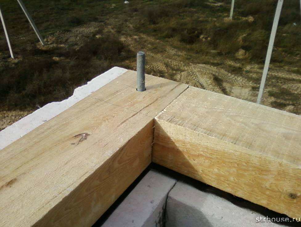 - Сверху гидроизоляции укладывают мауэрлат из бруса 150 х 150 мм общей длиной (3 + 6) х 2 = 18 м. По углам бруса делают выборки, стыки скрепляют скобами.