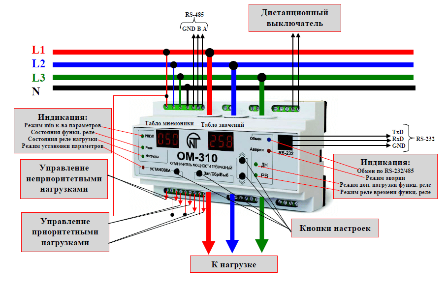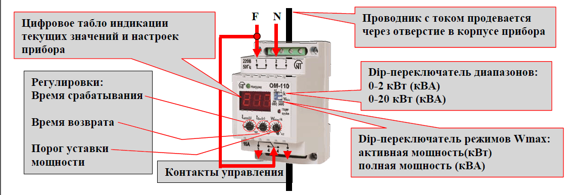 Нагрузка подключается через трансформаторы тока. Устанавливают параметры потребляемой мощности, времени отключения при перегрузке и времени восстановления после отключения. Обязательно использование контактора, который коммутирует нагрузку.