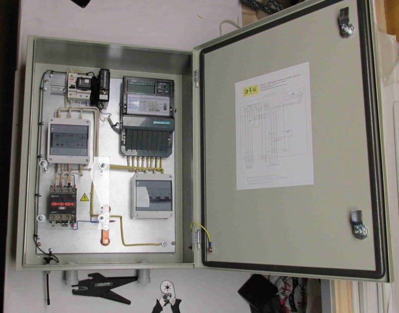 Все комплектующие элементы размещаются в общем электрощите. Вместе с вводным трехполюсным автоматом выполняется установка однополюсного автомата в цепь питания, подаваемого к катушке контактора – управлению. Это дает возможность использования в цепях управления проводов с меньшим сечением. Кроме того, провода силовых цепей и цепей управления разделяются между собой.