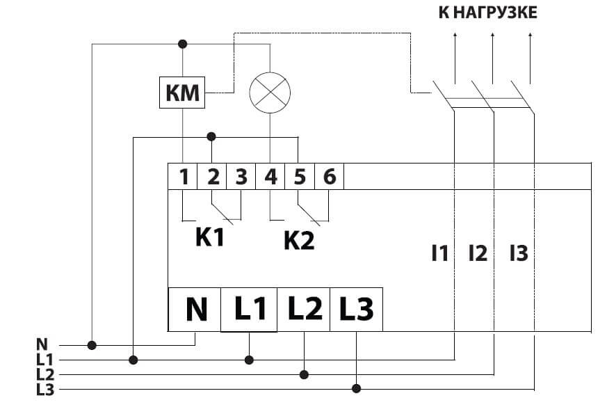 К нагрузке № 1 относятся объекты с повышенной мощностью, такие как теплые полы, различные виды нагревателей, духовые шкафы и другое аналогичное оборудование. После их отключения нагрузка № 2 остается без защиты от перепадов напряжения в сети. В схеме задействовано реле нагрузки (один выходной контакт) и функциональное реле также с одним контактом.