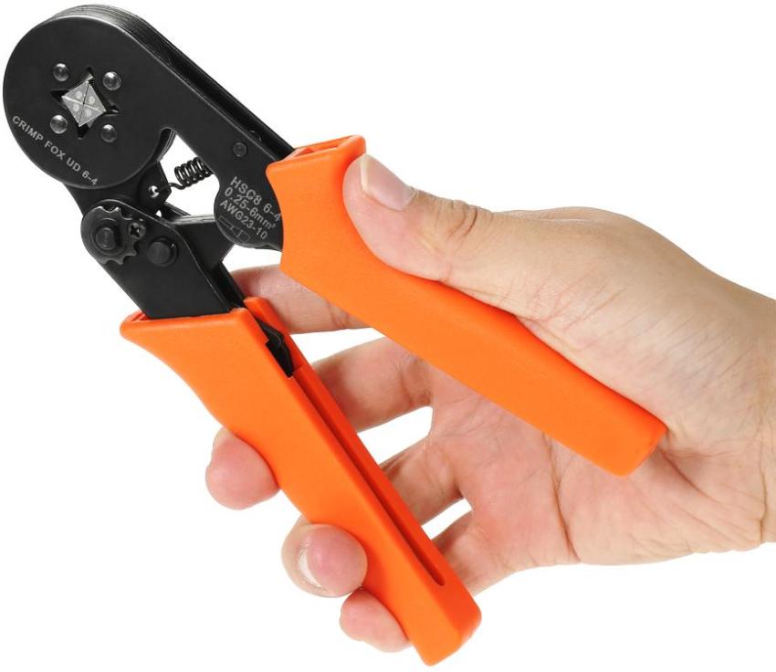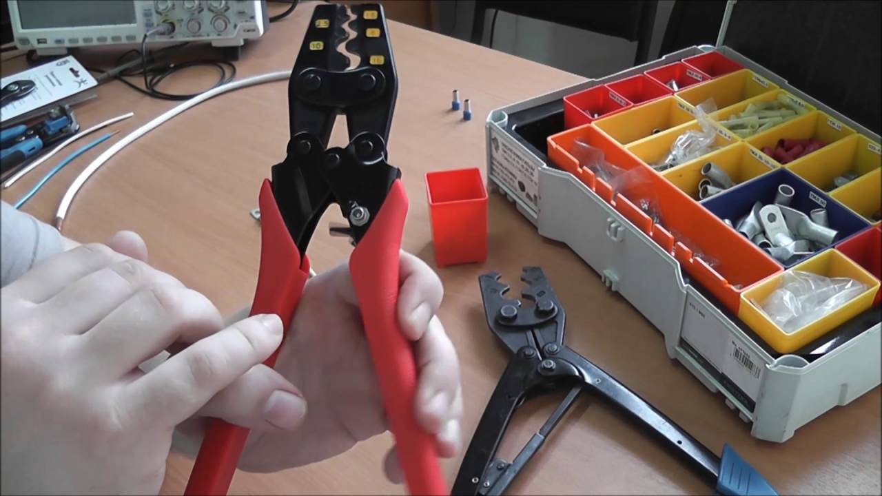 После подбора подходящих наконечников и проводов понадобится специальный инструмент. Пресс-клещи напоминают пассатижи, в конце которых есть специальная матрица, куда устанавливаются наконечники и не изолированный участок кабеля
