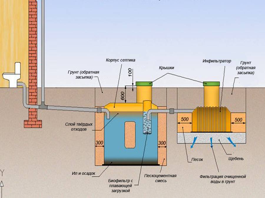 Колодец с септиком. Септик представляет собой несколько последовательно прикрепленных друг к другу камер, в которых находятся сточные воды. Осадок перерабатывается бактериями, а затем очищенная жидкость поступает в почву.