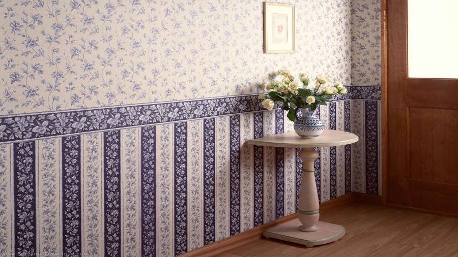 Комбинация для кухни и ванной комнаты. Рабочая область и зона контакта с водой отделывается плиткой, остальная часть предоставлена обоям. Комбинация может иметь контрастное сочетание или иметь общий цвет и элементы.
