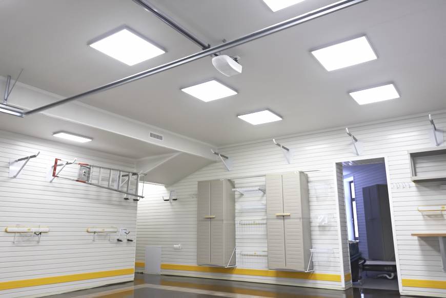 Основное требование к схеме освещения гаража состоит в том, чтобы помещение было полностью и равномерно озарено. Как правило, освещение гаража своими руками делают комбинированным. Этим достигается равномерная освещенность не только центра гаража, но и конкретных мест. Люминесцентное и светодиодное освещение гаража делают основным, а рабочих зон и стеллажей — вспомогательным (точечным).