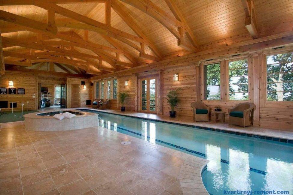 - Не стоит забывать, что баня – это не только парилка, но и бассейн, а также душ. Нужно сделать так, чтобы эти помещения не отличались от общего вида и гармонично смотрелись. Для этого лучше выбирать схожие со стилем парилки элементы. К примеру, если отделка из дуба, лучше добавить изделия красных и золотых цветов.