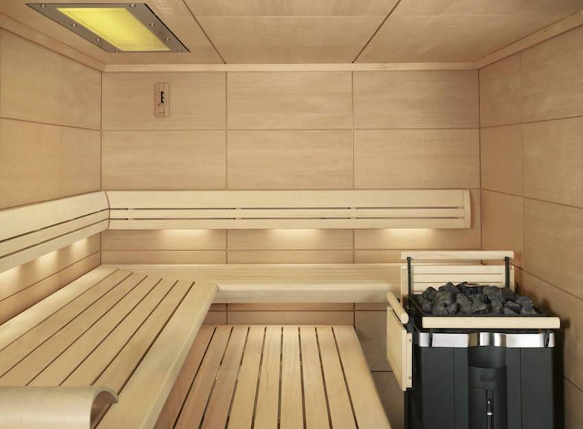 Интерьер парной с приятным сочетанием дерева, камня и стали