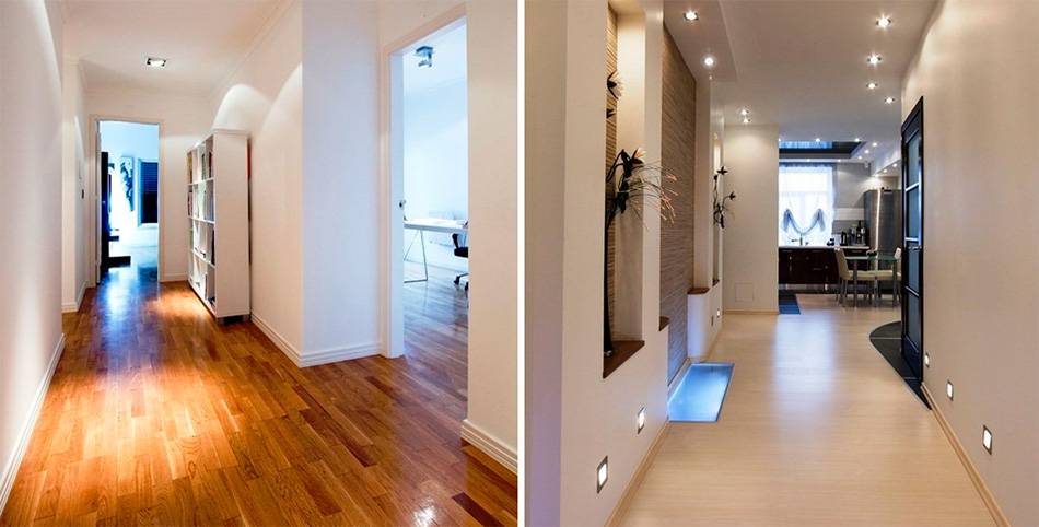 Длинные коридоры должны быть поделены на зоны с различным освещением. Необходимо чтобы общий и местный свет в таком помещении чередовался.