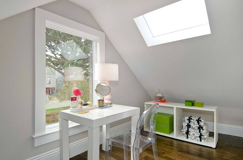 Не стоит стремиться сделать потолок горизонтальный, тем самым украв большую часть пространства. Лучше в кровлю добавить ещё несколько окон и сделать помещение очень и очень светлым. Занавески на мансарде не должны занимать много места. В идеале это римские или рулонные шторы.