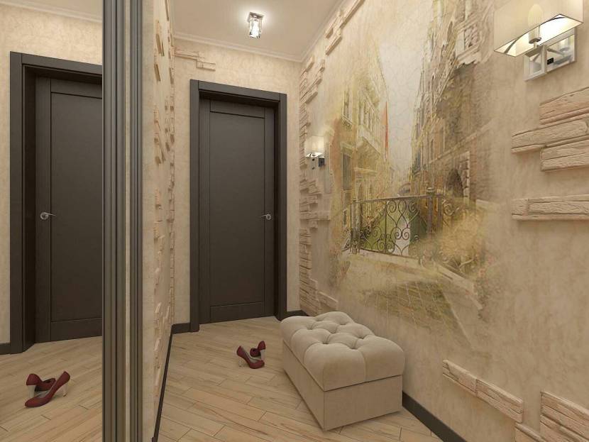 Если пространство прихожей недостаточно велико, от использования разных по фактуре декоративных изделий лучше отказаться. Уместно выбрать какой-то один вариант, или же включать материалы, схожие по оттенку.