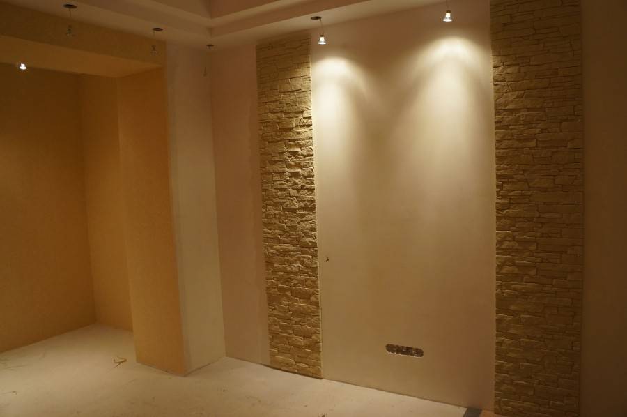 Если сзади установить подсветку, она выделит рисунок камня. В маленькой комнате применяется «рваная» кладка – сочетание с штукатуркой.
