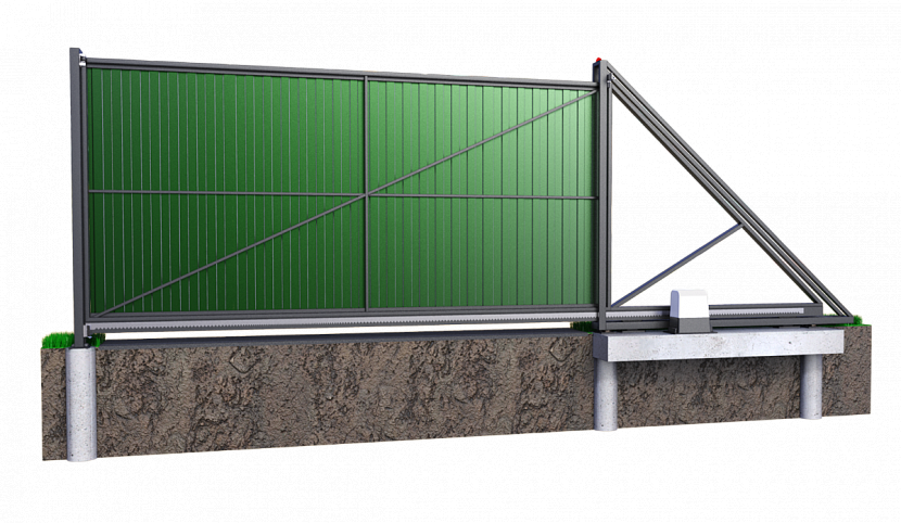- Консольный тип представляет собой передвигаемую вдоль проема консоль, на которую крепится (сверху, снизу или посередине) полотно. Сам механизм опирается на два столба, установленные на одной стороне забора, что исключает необходимость в оборудовании направляющих, а также снимает ограничение по высоте машины, как с верхней трубой. Несмотря на самую высокую сложность конструкции, именно такой тип наиболее подходит для установки в суровом климате.