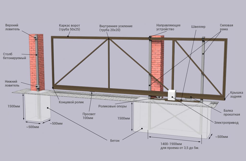 Когда делаются откатные ворота своими руками пошаговая инструкция дает понять, что в конструкции должны присутствовать улавливатели, ролики и специальная поддерживающая шина