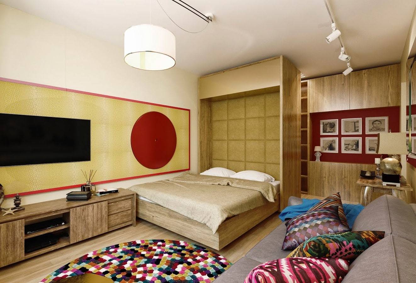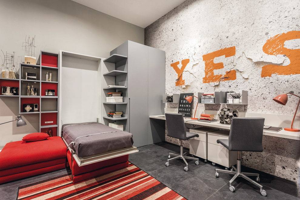 В отличие от классического варианта, откидная кровать делает дизайн более оригинальным. Для того чтобы задействовать всю стену, можно использовать интегрированную мебель, представляющую единое целое.