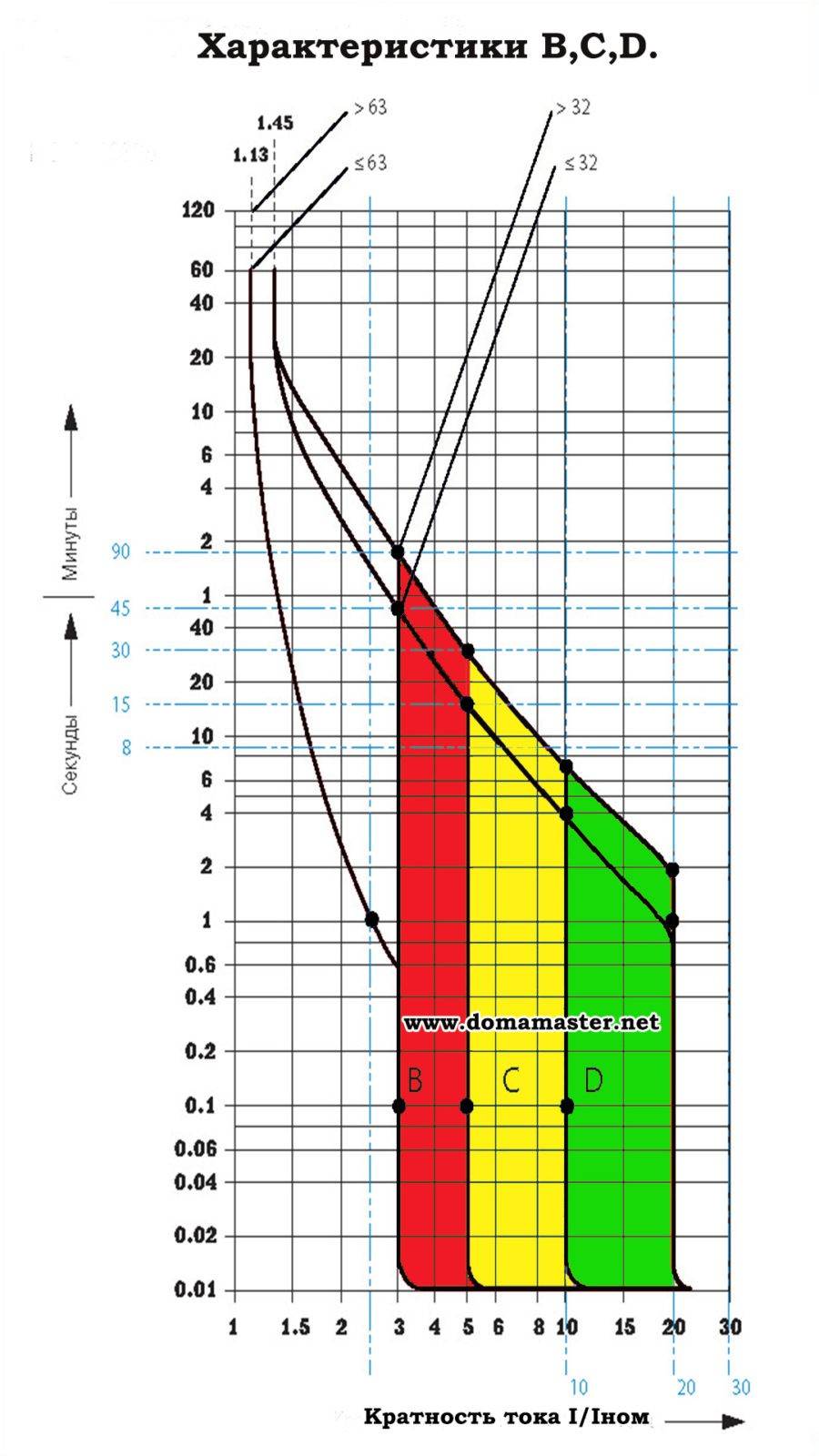 Эти буквы указывают ток мгновенного срабатывания электромагнитного расцепителя автомата. Проще говоря, характеристика срабатывания автоматического выключателя показывает чувствительность автомата – наименьший ток при котором автомат отключится мгновенно.