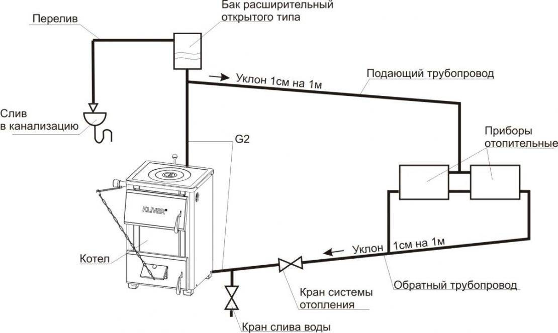 Также нужно знать, что система отопления открытого типа требует правильного размещения приборов – котел отопления в самой нижней точке схемы, расширительный бак – в самой высокой.