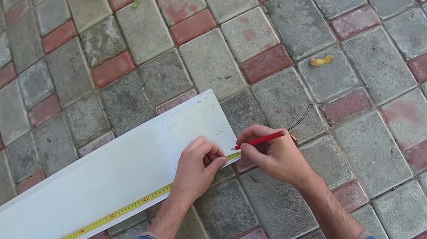 - Теперь необходимо определиться с шириной отлива. Учитывая, что крепление производится под наклоном (около 15 град.) нужно приложить линейку от стены на край цоколя. Отметить маркером точку приложения. Ширина рассчитывается с учетом выпуска за край на 2-3 см.